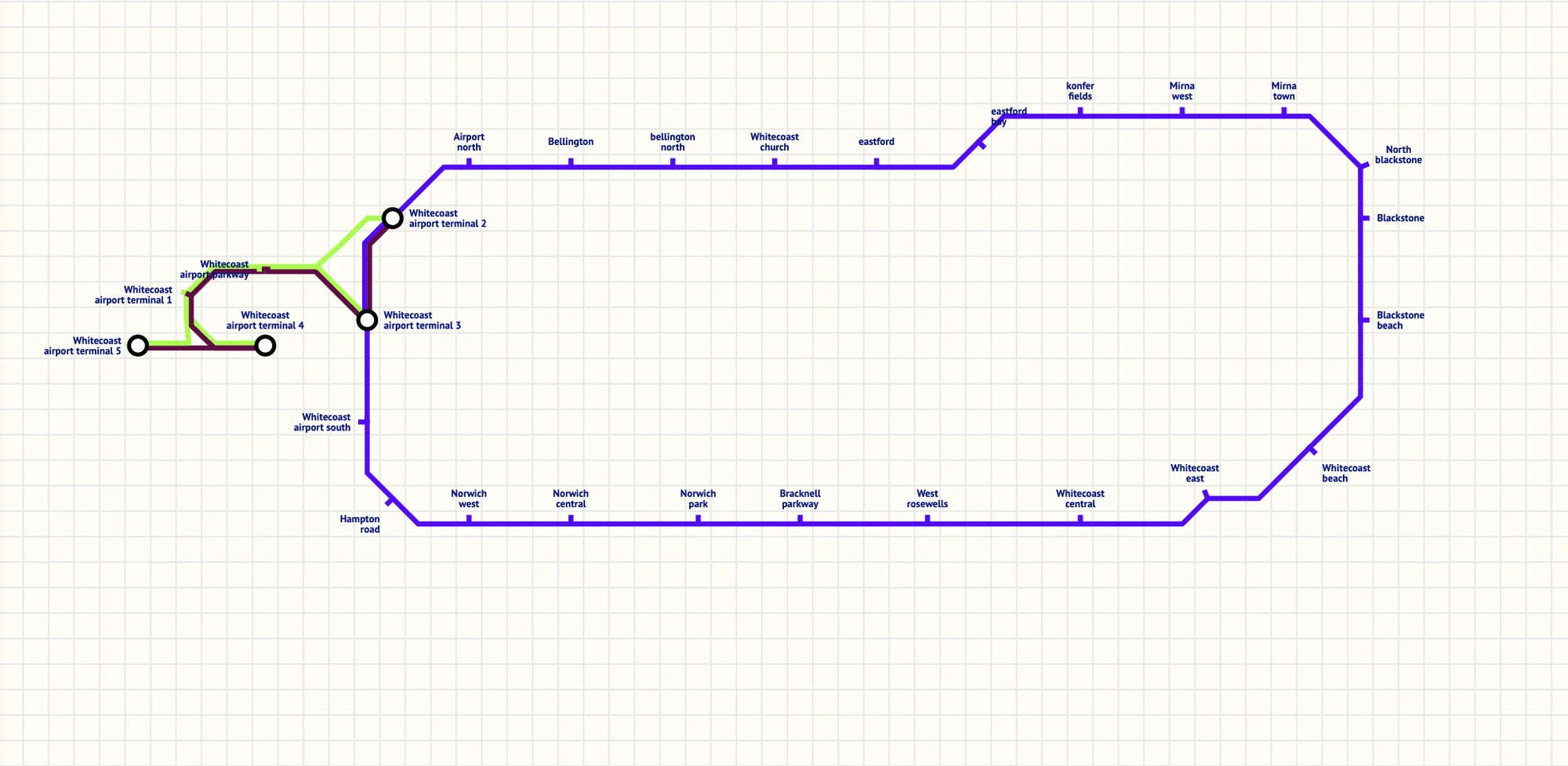 Btw guys, The airport link will go to several places, which include Chinchester city, Whitecoast central, Mirna town, Redborough, and Rosewells. No service from NC bcz its close to the airport and there is also going to be a shuttle that runs with a class 185 triple unit that has 9 coaches. (shuttle is that red line.)